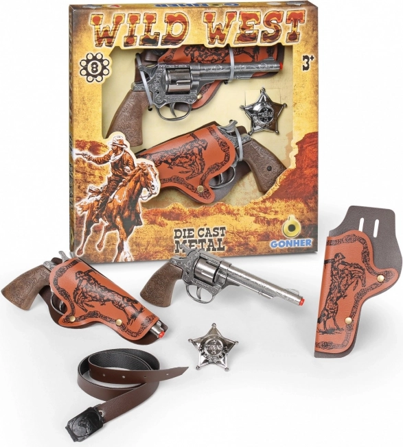 Odkrijte pristno zabavo na Divjem zahodu s setom GONHER – dva kovinska kavbojska revolverja z bobničem za 8 nabojev, dopolnjena s stilskim etuijem in značko šerifa. Idealno za tematske igre, kostume in male pustolovce.