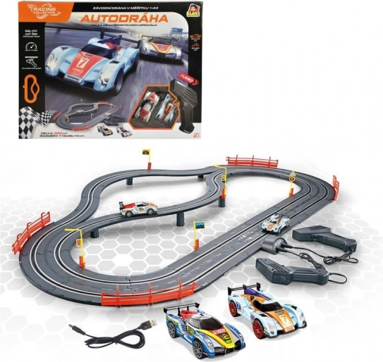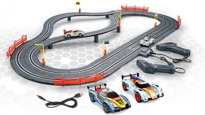 Avtocesta 300 cm z USB napajanjem, brez napajalnika. Dva avtomobila, dva upravljalnika, most in dodatki. Odlična zabava za otroke od 8 let in odrasle.