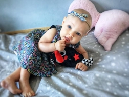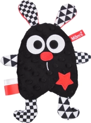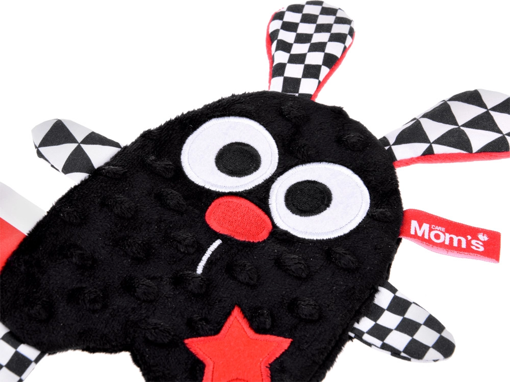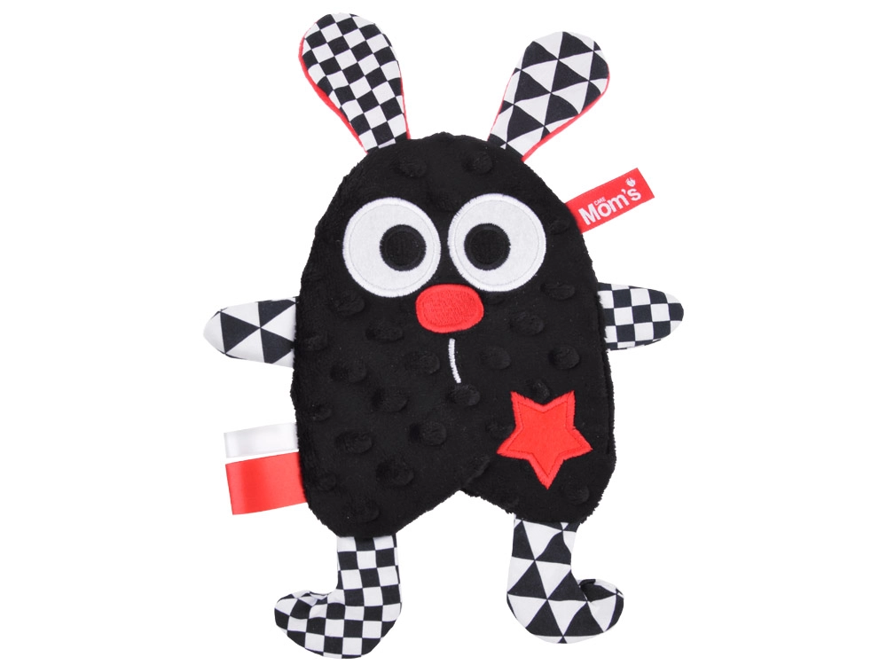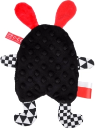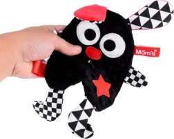 Prisrčen kontrastni šumeči spremljevalec, sešit iz mehkih materialov, zasnovan z mislijo na dojenčke. Idealen kot prva igrača od prvih dni življenja. Različne teksture materialov ter črno-belo-rdeče barve skupaj z geometrijskimi vzorci spodbujajo čute in vid dojenčka.