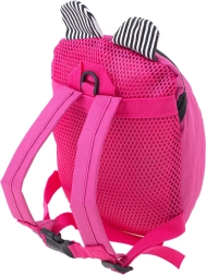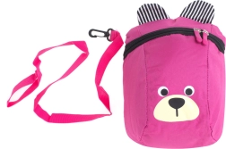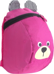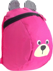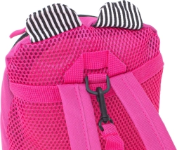 Prijazen obraz medvedka in črtasti ušeski spodbujajo otroke, da nahrbtnik radi nosijo in skrbijo za svoje stvari.