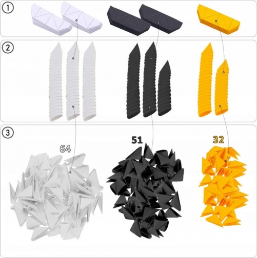 V paketu najdete 147 papirnatih elementov in podrobna tiskana navodila. Za vizualne tipe je na voljo tudi video vodič, ki vas popelje skozi celoten proces zlaganja. Set je odličen za ustvarjanje doma, šolske delavnice in kot darilo za male ustvarjalce.