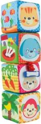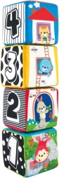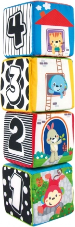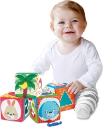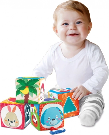 Odkrijte komplet 4 barvitih, tekstilnih kock za dojenčke in malčke, ki razvijajo čutno zaznavanje, fino motoriko in učenje številk in oblik. Vsaka kocka ima različne teksture, varno zrcalce ter ilustracije živalic, številk in oblik. Kocke lahko zlagate v stabilno piramido in iz njih sestavljate slikovne serije za zabavno učenje.