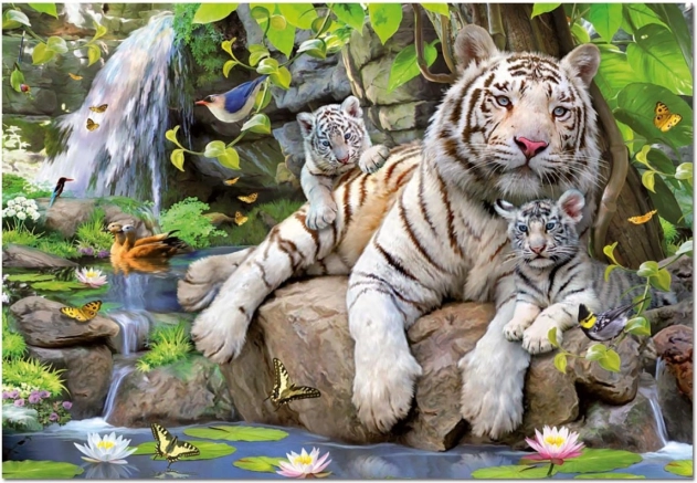 Edicija sestavljank Beli Tigri vam prinaša čudovito sceno z belimi tigri v bujnem džungelskem okolju. Ta sestavljanka s 1000 koščki ponuja ne le zabavo, temveč tudi miselni trening; zaradi svoje trajnosti in elegantnih barv je idealno darilo!