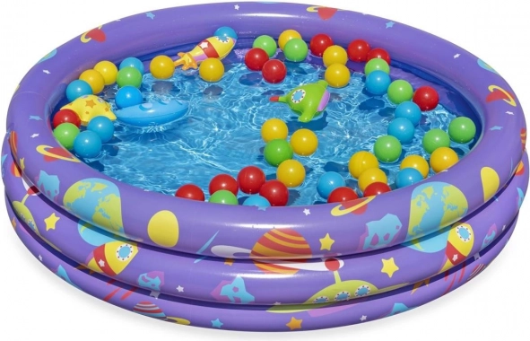 Ta pisani bazen Bestway Intergalactic je narejen tako, da otroci ne le uživajo na prostem, ampak tudi uživajo v vodi. S tremi enakimi napihljivimi obročki z barvno grafiko in kapaciteto 140 litrov prinaša veliko veselja.
