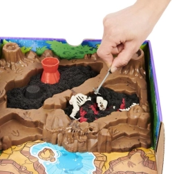 Spremenite otroško sobo v prazgodovinsko najdišče! Komplet Kinetic Sand Dinozavrska izkopavanja združuje senzorično igro, ustvarjanje in odkrivanje. Med kopanjem v črnem pesku naletite na rdečo plast, ki spominja na vročo lavo, nato pa na skrite kosti. Iz najdenih delov sestavite podrobna okostja treh ikoničnih dinozavrov in spodbudite domišljijo.