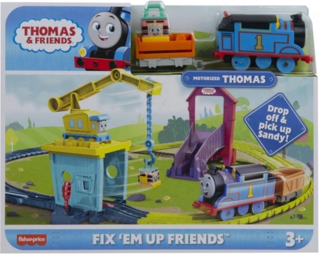Podoživite priljubljene zgodbe s kompletom Tomaž in prijatelji z žerjavko Carly in hitrim vozilom Sandy. Motorizirani Tomaž vozi po popolni krožni progi, žerjavka Carly s kavljem naklada tovor in malo lokomotivo, tobogan pa vrača Sandy nazaj k žerjavki. Združljivo z večino plastičnih prog Thomas & Friends (razen lesenih). Idealno za predšolske otroke od 3 let.