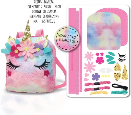 Komplet za šivanje – nahrbtnik s samorogom – je idealna ideja za prosti čas. S tem kompletom si lahko vsako dekle sešije nahrbtnik približnih dimenzij 23 cm x 20 cm x 6,5 cm, ki bo popoln modni dodatek. Komplet vsebuje: filcane in plišaste elemente, pripravljene za šivanje, okrasne elemente, nit, plastično iglo in navodila.