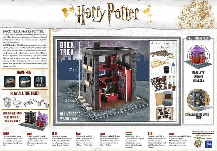 Ustvarite podroben 3D model slovite trgovine s čarovniškimi paličicami in dodajte svoji zbirki iz sveta HARRY POTTER edinstven značaj. Sestavljanka uporablja prave mini opeke, lesene elemente in dekoracije iz kartona, mahu in kamnčkov, zato končna zgradba deluje realistično in je idealna za igro in razstavljanje.