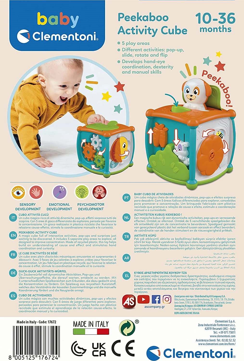 Barvita in dinamična kocka Clementoni iz linije Baby, polna zabavnih aktivnosti in presenetljivih učinkov. Idealna za razvoj tipnih in motoričnih sposobnosti s pomočjo kukajočih živalic in enostavnega prijema.