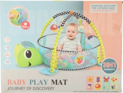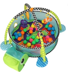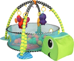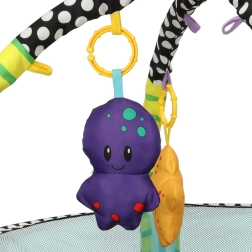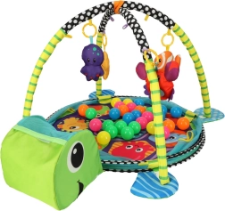 Igrače in žogice: Podloga vsebuje barvite in mehke igrače, kot so ribica, hobotnica, zvezda ter škatlica z ogledalcem. Poleg tega 30 plastičnih žogic v živih barvah spodbuja otrokove čute.