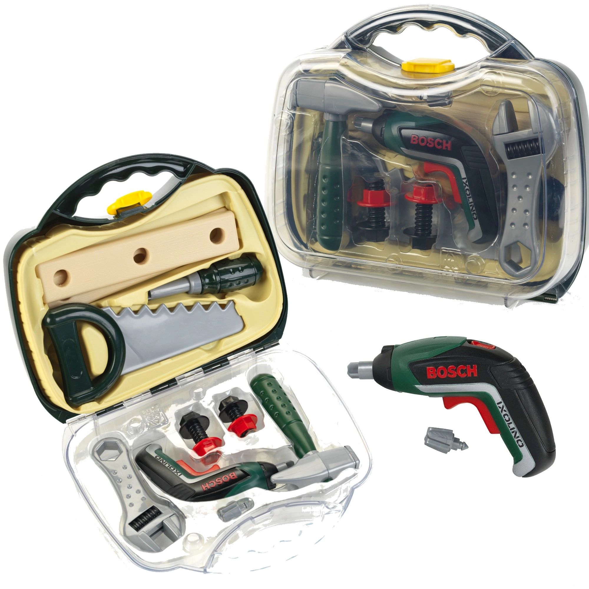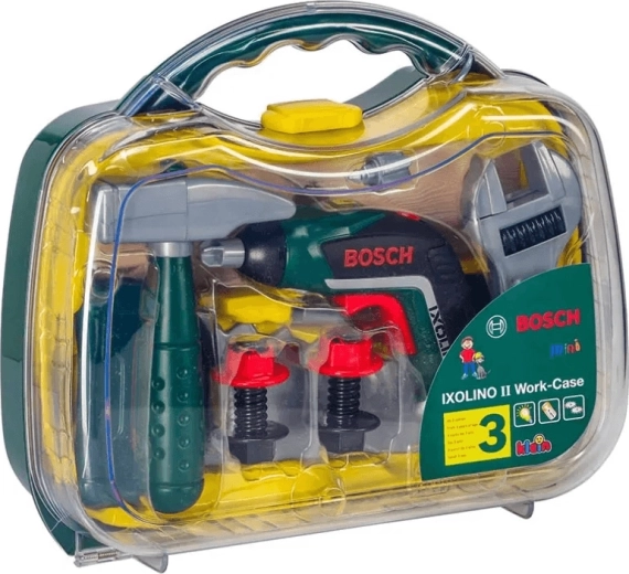 Otroški kovček z orodjem iz licenčne serije BOSCH Mini znamke KLEIN ponuja realistično igro popravljanja. V notranjosti je akumulatorski vijačnik Ixolino II na baterije z vrtenjem v desno/levo in zvokom motorja, dopolnjen z drugimi trpežnimi orodji. Trden temno zelen kovček s prozornim pokrovom in dvema rdečima zapirala varno drži vse na mestu in je idealen za male mojstre od 3 let dalje.