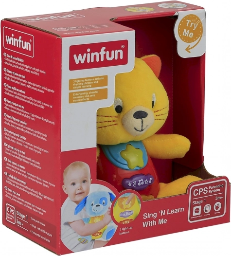 Interaktivni plišasti mucek navduši dojenčke in malčke s pisanimi barvami, lučkami in prijetnimi zvoki. Otroci hitro vzljubijo tri osvetljene gumbe, ki predvajajo melodije, zvoke in govorjene fraze ter hkrati na zabaven način predstavljajo prve črke in številke.