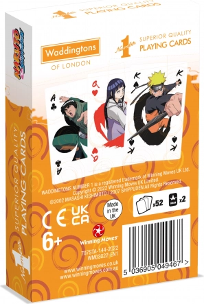 Slogovne igralne karte z motivi NARUTO SHIPPUDEN znamke Waddingtons prinašajo vrhunsko kakovost in barvite ilustracije likov. Idealne za priljubljene igre, kot so Kent, pasians ali klasični družinski večeri s kartami. Odlično darilo za oboževalce animeja in ljubitelje kart.