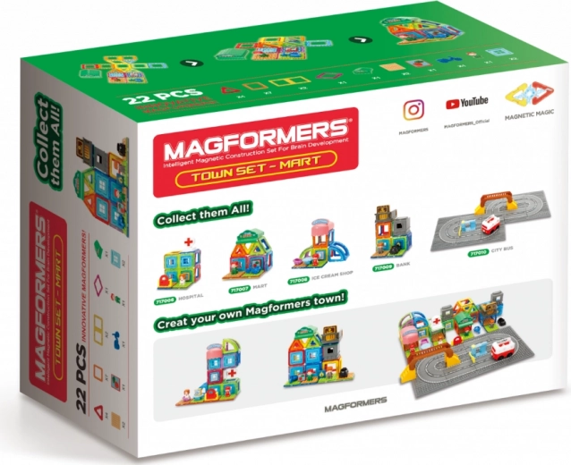 Sestavljanka je združljiva z drugimi seti iz serije Mestece. Z njimi lahko zgradite svoje lastno mesto in kombinirate različne tematske sete, kot so Bolnišnica, Slaščičarna, Banka in Avtobus. Namenjena je otrokom od 3 let in vključuje 7 kvadratov, 4 trikotnike, 2 pravokotnika, 1 romb, 7 plastičnih dodatkov in 1 figurico. V kombinaciji z drugimi kosi Magformers in znano sestavljanko Geomag ponuja še več možnosti za igrivo ustvarjanje.