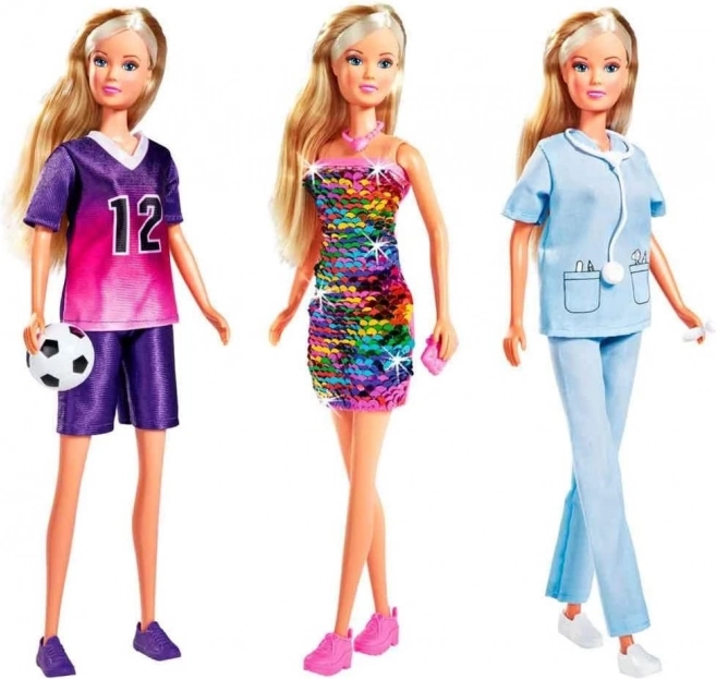 Punčka Steffi in 3 različni kompletI oblačil: bleščičasta obleka SWAP, zdravniški komplet in nogometni komplet. Priloženi so dodatki.