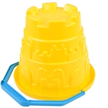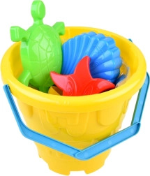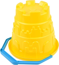 Plastično vedro z modrim ročajem in modelčki v notranjosti omogoča enostavno prenašanje na plažo ali na vrt.