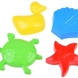 Štirje plastični modeli v obliki račke, školjke, želve in zvezde za enostavno in zabavno oblikovanje dinamičnega peska.