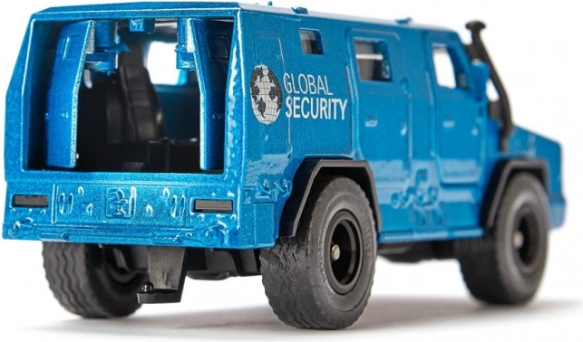 Ta modri varnostni transporter v merilu za otroško igro izstopa po robustni kovinski izdelavi in avtentičnih detajlih karoserije – maska, žarometi, ročaji in vtisi panelov. Zahvaljujoč prosto vrtečim se kolesom je pripravljen na dinamično vožnjo po tleh ali igralnih stezah. Premišni elementi razkrijejo notranjost s sedeži in tovorni prostor za “dragocen tovor”.