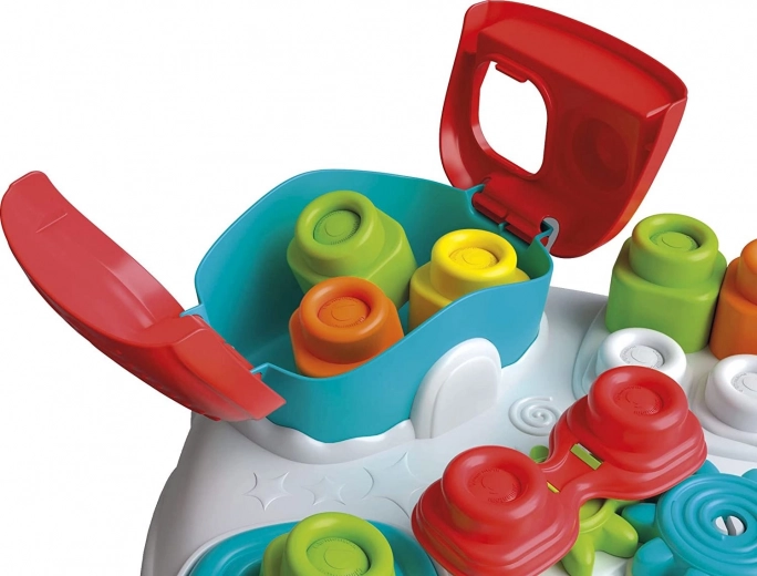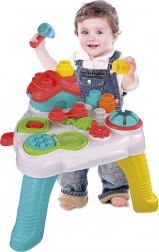 Miza ponuja širok nabor aktivnosti za razvijanje otrokovih motoričnih veščin, kot so zobniki, katapult za kocke in pokajoči mehurčki.