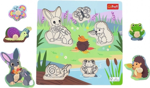 Odkrijte igrive in varne lesene sestavljanke z živalmi s travnika, idealne za najmlajše od 18 mesecev. Zahvaljujoč lesenim gumbkom se deli enostavno držijo, barvita grafika vabi k igri, črno-bela predloga v podlagi pa olajša pravilno namestitev. Igrača razvija fino motoriko, koordinacijo oko–roka in zaznavanje oblik.