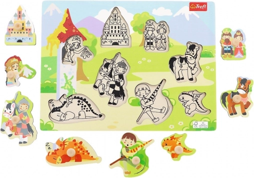 Ta srednje velika lesena sestavljanka z motivom gradu je odlična izbira za prve puzzle. Podlaga ima izrezane oblike ter črno-bele predloge, ki otrokom pomagajo pravilno umeščati posamezne kose. Vsak od 8 kosov je opremljen z lesenim gumbom za enostaven oprijem malih rok.