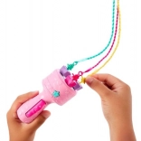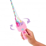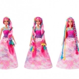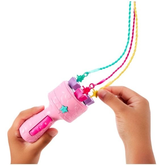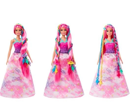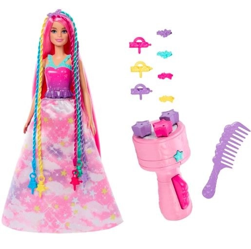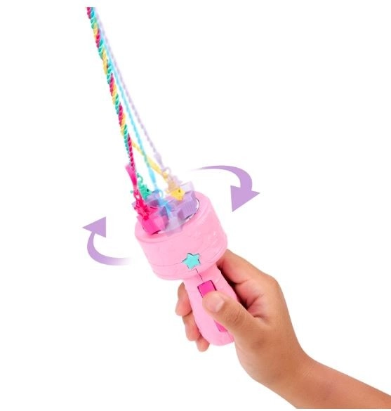 Punčka Barbie iz pravljičnega sveta Dreamtopia ima zelo dolge lase z mavričnimi prameni, ki kar vabijo k urejanju. Dovolj je, da v pripomoček za pletenje vstavite 2–3 pramene in z enim pritiskom ustvarite očarljive zvite pričeske. Tri mavrične špangice držijo pričesko na mestu, barvite sponke pa dopolnijo končni videz.