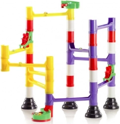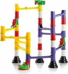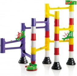 Modularne cevi, stebri in tirnice se natančno prilegajo. Otroci hitro razumejo logiko gradnje in lahko neprestano spreminjajo pot kroglic.