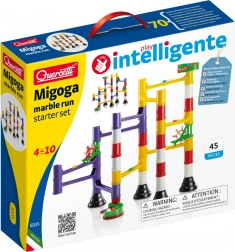 Začetni set Migoga ponuja razgibano konstrukcijsko igračo s stabilnimi bazami, stebri in barvitimi progami, ki se preprosto zaskočijo skupaj. S pomočjo zbiralnih košev, spiral, mostov, mlinskih koles ter vzmetnih zalogovnikov ustvarite tekoče in dinamične poti, po katerih kroglice drsijo z nadstropja v nadstropje.