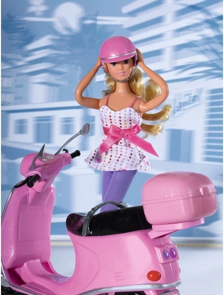 Punčka Steffi v poletnih oblačilih, s čelado in sončnimi očali na skuterju s kovčkom.