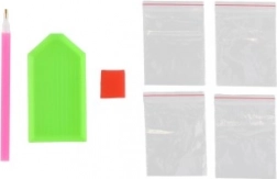 V setu boste našli platno s predtiskano sliko, pero za nanos kamenčkov, posodo za kamenčke, vosek in set barvnih kamenčkov.