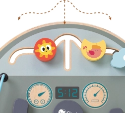 Vrtljivo koleščko, kroglice, labirint, rolica in vrtljivke ustvarjajo realističen občutek vožnje ter otroke naravno spodbujajo k raziskovanju in osredotočeni igri.