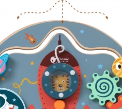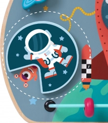 Raketa s planeti in zvezdami naravno vzbuja radovednost in otroke spodbuja k raziskovanju posameznih elementov – od labirinta do vrtljivih kolesc.