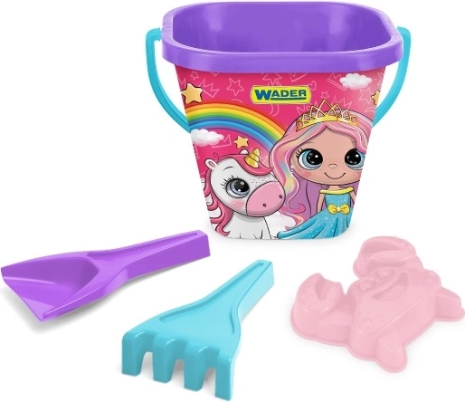 Odkrijte veselje igre v pesku s kompletom za pesek IML, 4 deli. Praktično 2‑litrsko vedro z močnim ročajem in neodrgnljivim IML tiskom (npr. princeske z mavrico in samorogom ali veseli avtomobilčki) dopolnjujejo lopatka, grablje in modelček raka ali čolnička. Odporna zasnova prenese sonce in vodo ter je pripravljena na vsakodnevne dogodivščine na plaži in igrišču.