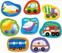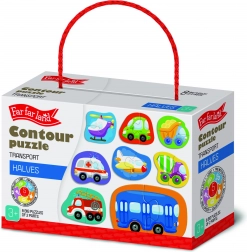 Odkrijte svet prevoznih sredstev z obrisnimi sestavljankami, ki so posebej zasnovane za malčke. Vsaka izmed 8 slik je sestavljena le iz dveh trdnih koščkov, kar olajša prve korake pri sestavljanju in krepi samozavest malih igralcev. Zaradi kontrastnih oblik in jasnih motivov otroci hitro razumejo princip povezovanja.