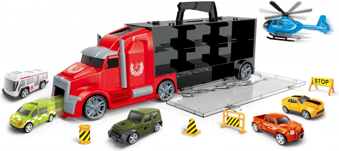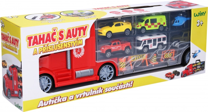 V kompletu je 5 avtomobilčkov in 1 helikopter, zato se zabava lahko začne takoj po odprtju. Praktičen izvlečni ročaj na zgornji strani prikolice olajša prenašanje. Dobavljeno s češko embalažo.
