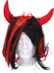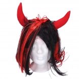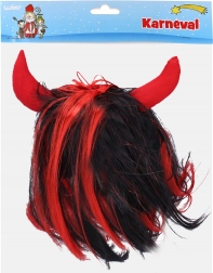 V hipu ustvarite pristni peklenski videz. Ta lasulja združuje goste črne lase z izrazitimi rdečimi prameni in lahkimi tekstilnimi rogi, ki držijo obliko in kostumu dodajo pravi šarm.