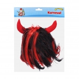 Stilska hudičeva lasulja s črnimi lasmi in rdečimi prameni, dopolnjena z tekstilnimi rdečimi rogi. Idealna za Miklavža, pustne plese in tematske zabave. Enostavno nameščanje in takojšen peklenski učinek.