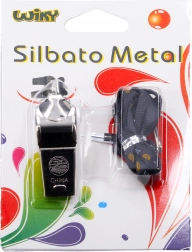 Klasična otroška kovinska piščalka velikosti 5 cm s kroglico in vrvico za obešanje okoli vratu.