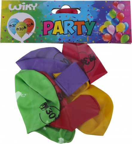 Komplet 5 lateks balonov 30 cm v mešanici barv s številko 30. Idealna dekoracija za 30. rojstni dan ali obletnico. Primerni za napihovanje z zrakom ali helijem.