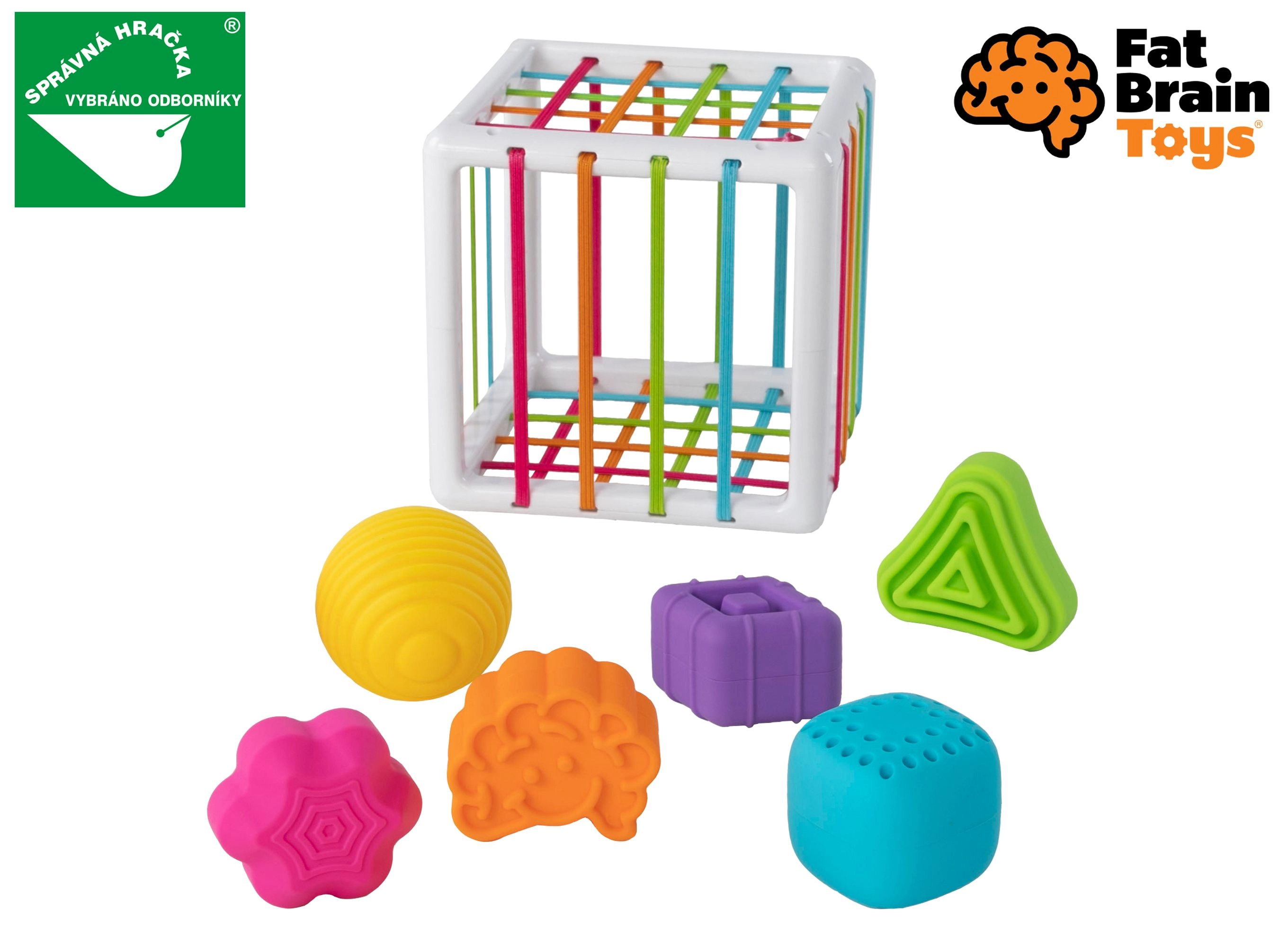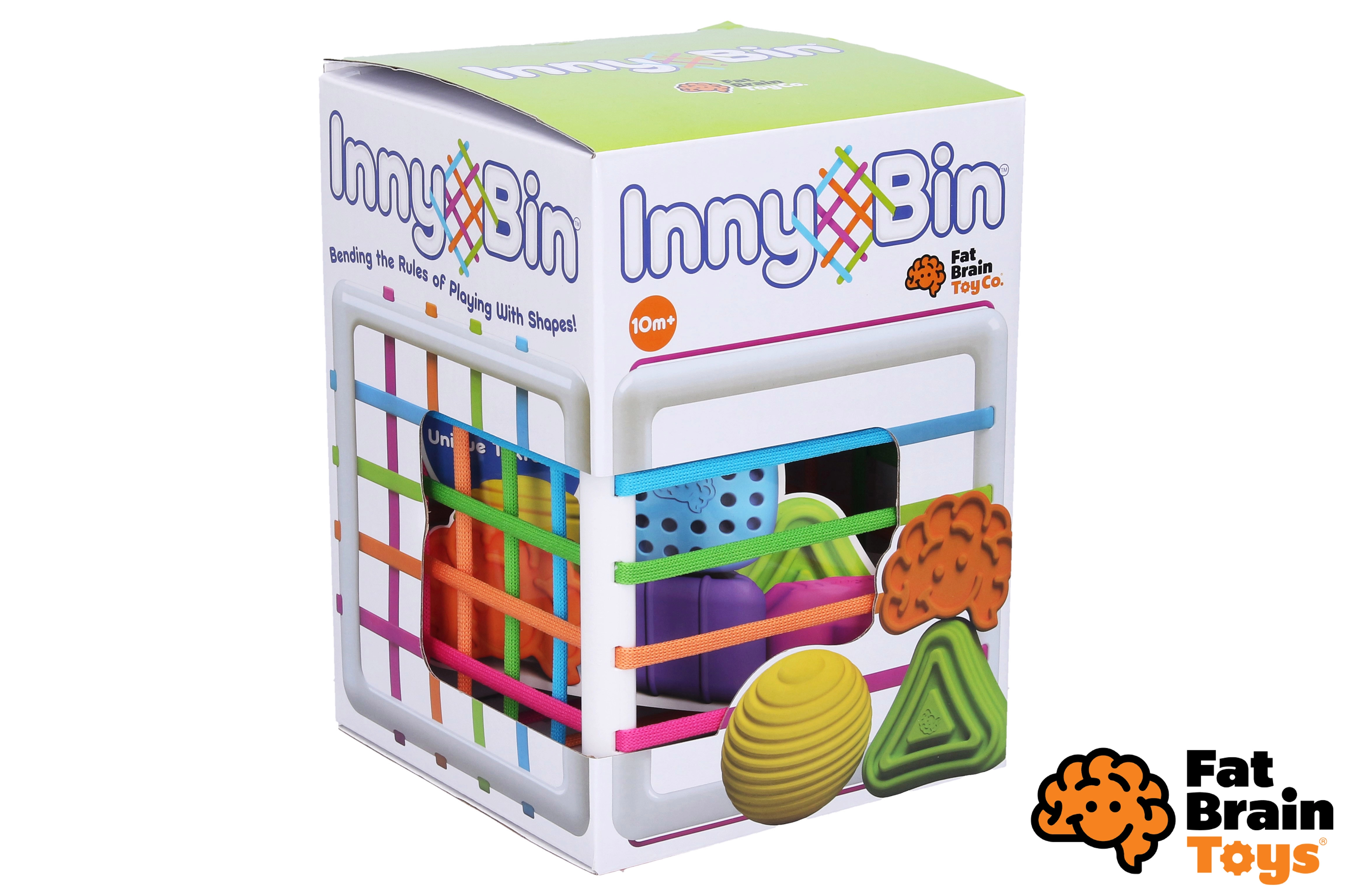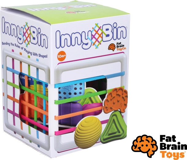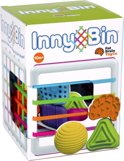 InnyBin podjetja FAT BRAIN je sodobna vstavljanka, ki klasično razvrščanje oblik spreminja v interaktivno senzorično igro. Otroci lahko oblike stiskajo, prijemajo, vstavljajo in izvlečejo skozi barvite elastične vrvice – brez potrebe po natančnem zadetku odprtine. To razvija spretnost prstkov, potrpežljivost in naravno radovednost.