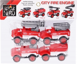 Ta set vsebuje štiri rdeče gasilske avtomobilčke dolžine 10,5 cm, vsak predstavlja drugačno vrsto gasilskega vozila: