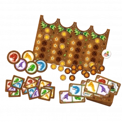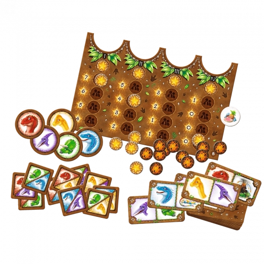 V kompletu najdete obojestransko igralno ploščo, 60 kart dinozavrov, začetne karte, žetone za osnovno in napredno različico, žetone lave, žeton priboljškov ter pregledna pravila.