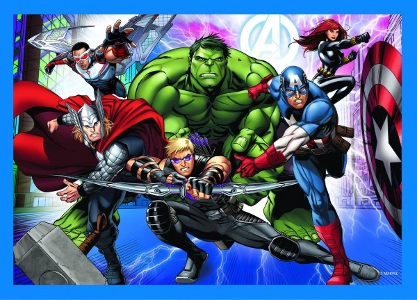 Otroška sestavljanka 4v1 AVENGERS: 4 slike 285×205 mm, 35/48/54/70 koščkov. Kakovostna izdelava, eko materiali, izdelano na Poljskem. Za otroke od 4 let.