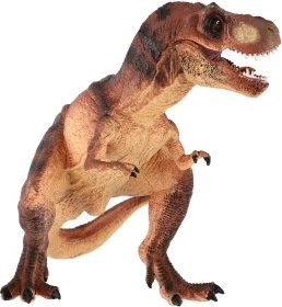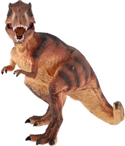 Vernotna tekstura kože, progasto obarvanje in odprt gobec z čekani figurici T-rexa dajejo izjemno živ videz.