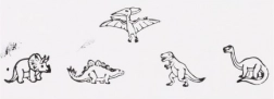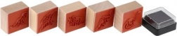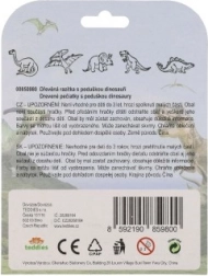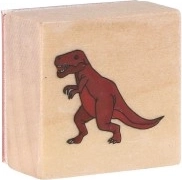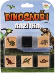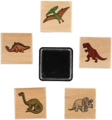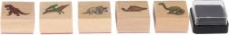 Pet lesenih žigov z motivi dinozavrov in črnilna blazinica v paketu – odprite in začnite žigati.