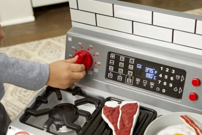 Vrtljivi gumbi in pregleden panel z indikatorji naredijo kuhanje realistično zabavno. Otroci lahko nastavljajo temperaturo in odpirajo vratca pečice – vse varno in preprosto.