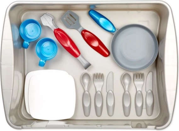 Del seta je 13 kosov dodatkov (krožnički, skodelice, pribor, lonec, ponev ipd.), ki spodbujajo samostojnost, koordinacijo oko–roka in socialne veščine pri igri s prijatelji.