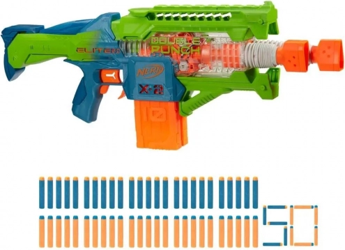 Izstrelek NERF Elite 2.0 Double Punch je zasnovan za maksimalen tempo in zabavo. Dve izmenjujoči se cevi se med streljanjem dinamično pomikata naprej in nazaj, skupaj z dvema nabojnikoma za po 10 puščic pa zagotavljata tekoč rafal brez nepotrebnih premorov. Motoriziran pogon omogoča hitro streljanje – le držite pospeševalni gumb in pritiskajte na sprožilec.