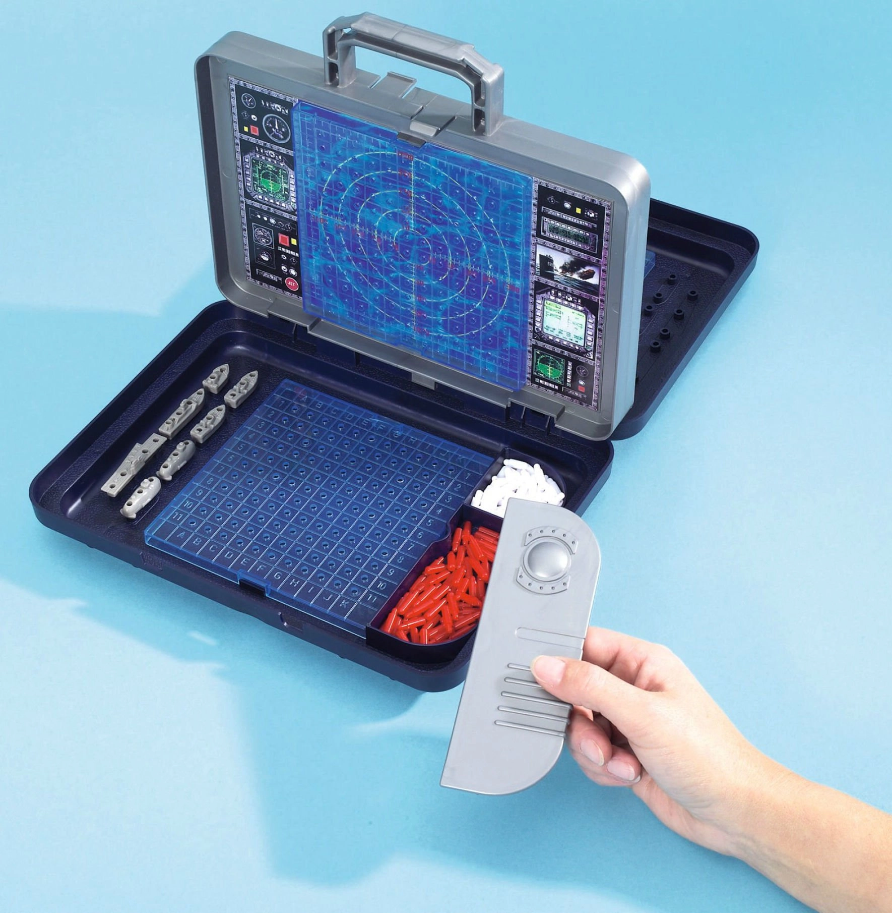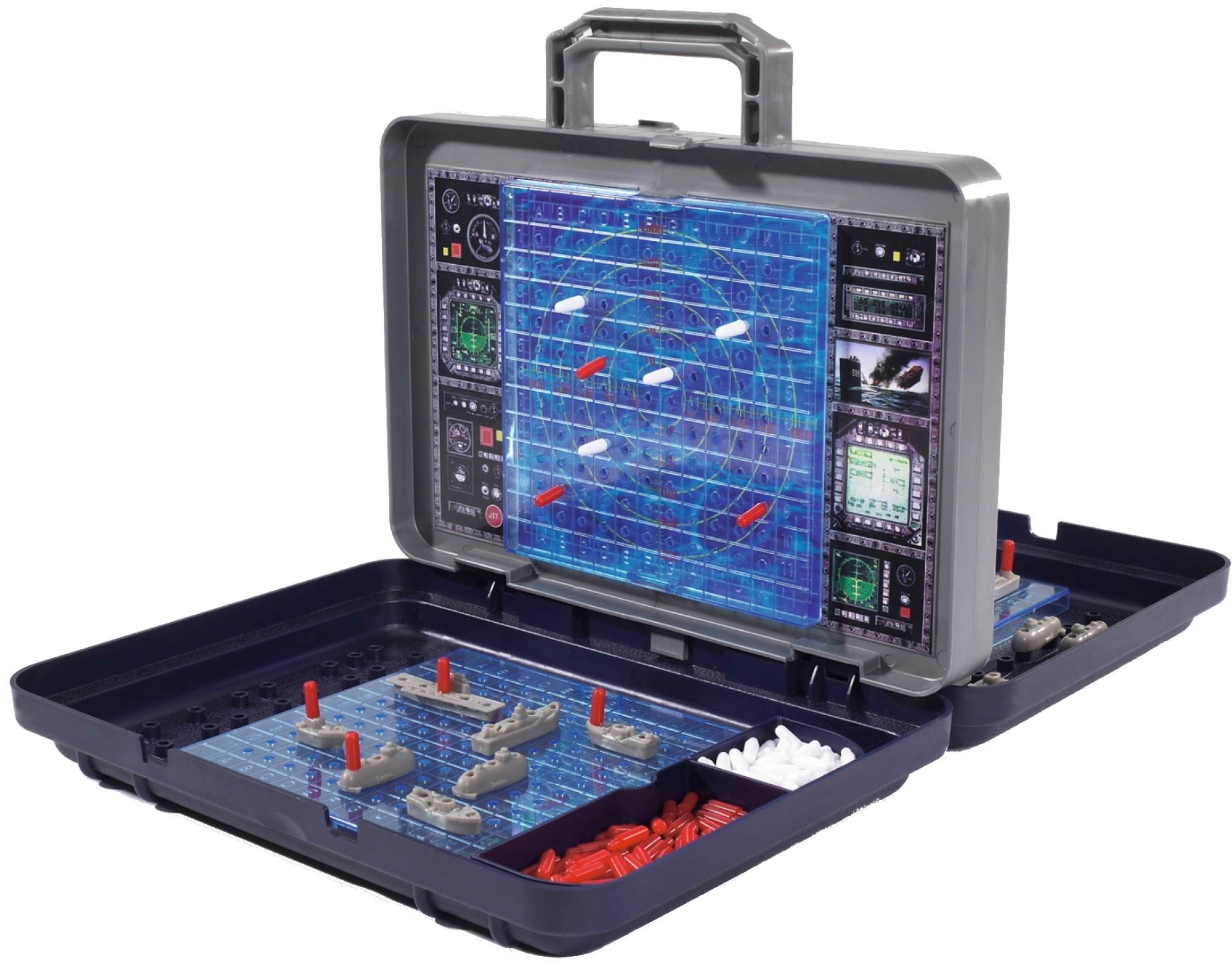 Srce seta je odstranljiva navpična stena, podobna radarju, ki ločuje obe igralni polji. Nanjo lahko beležite zadetke in zgrešene strele, obenem pa poskrbite, da si igralci ne bodo videli v razporeditev ladij. Vgrajeni predelki v kovčku poskrbijo, da vsi deli ostanejo lepo skupaj.