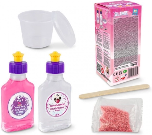 - Rožnato PVA lepilo z vanilijevim vonjem 100 ml, aktivator 100 ml, rožnato bleščilo 1,5 g, lopatica, posodica z zapiranjem